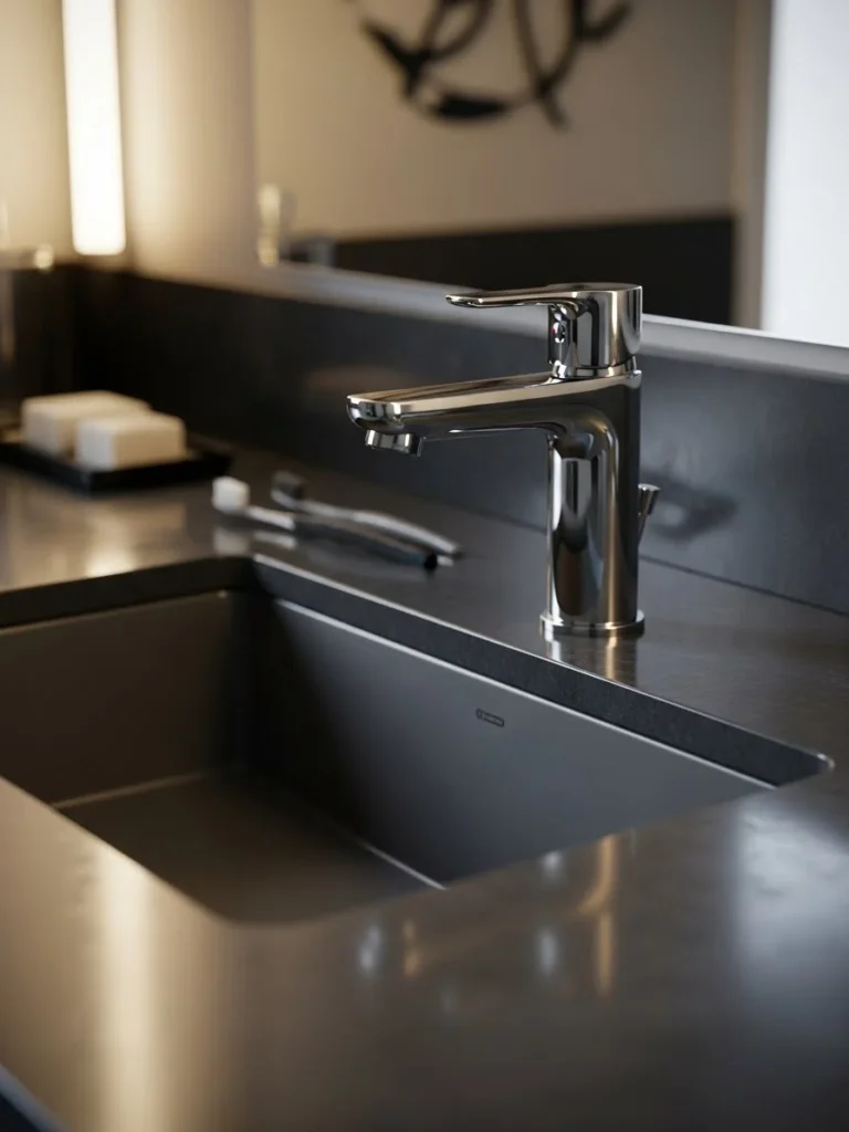 Overall, this sink area combines luxury, practicality, and style. The deep gray countertop paired with chrome fixtures creates a modern, refined environment. Ideal for homeowners seeking an elegant and functional bathroom centerpiece, it delivers sophistication and everyday usability.