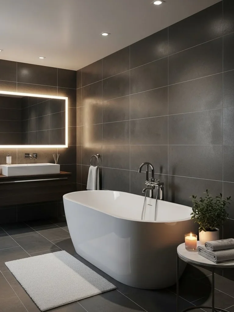 Overall, this bathroom balances style, comfort, and luxury. Dark gray tiles with chrome fixtures deliver a high-end, contemporary space perfect for homeowners seeking elegance, tranquility, and refined functionality in their bathroom.