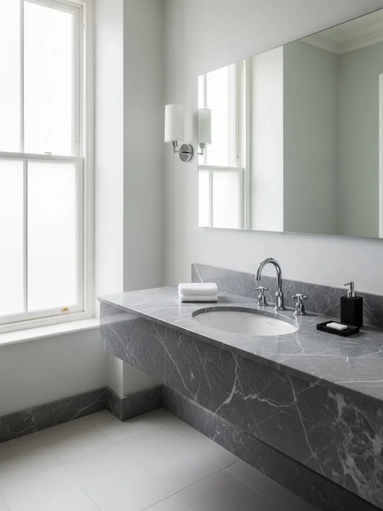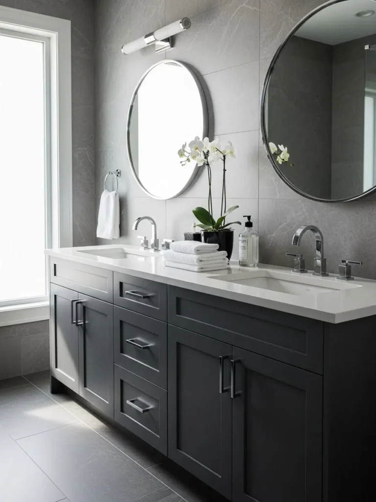Overall, this bathroom balances elegance, functionality, and modern luxury. The deep gray marble countertop and chrome accents create a sophisticated, high-end environment perfect for homeowners seeking a stylish and serene bathroom retreat.