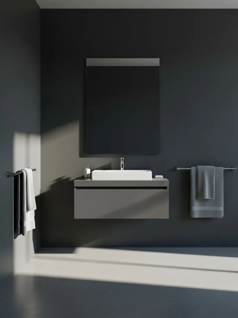 This minimalist deep gray bathroom features a floating vanity with polished chrome fixtures, creating a modern and refined design. The deep gray walls and floors provide a sophisticated backdrop, while chrome accents reflect light and add visual interest.