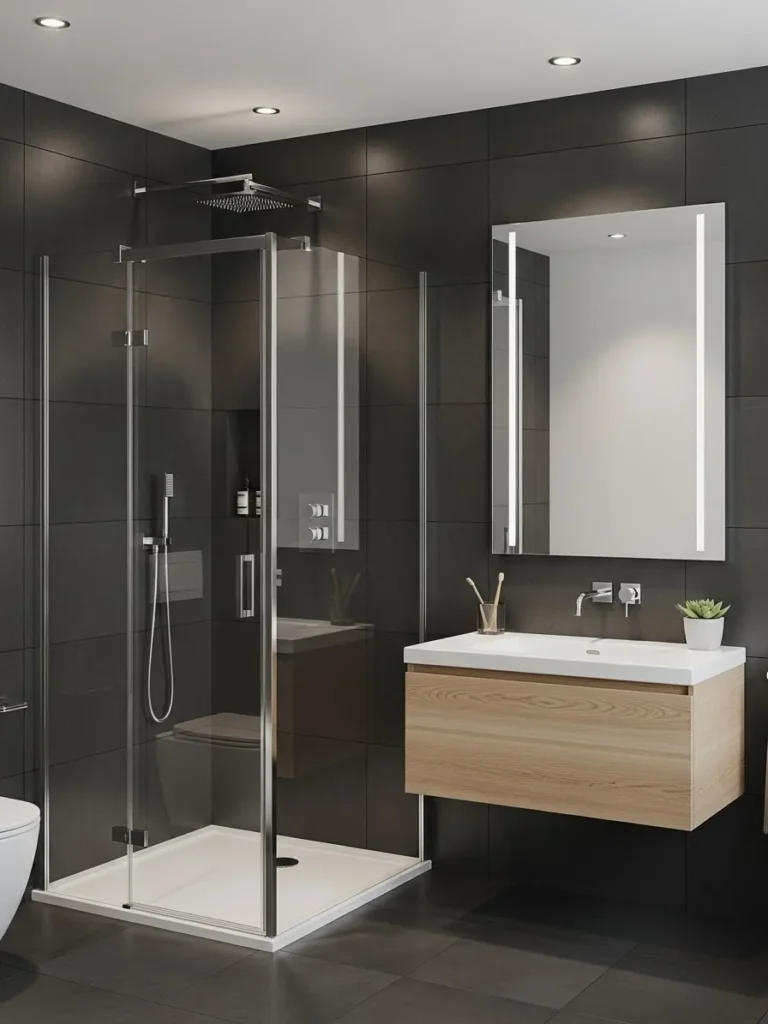 This bathroom perfectly combines functionality and style. The combination of deep gray tiles, floating vanity, and chrome accents creates a modern, luxurious space. Ideal for those who value sophistication, comfort, and timeless design, it offers both visual appeal and practical usability.