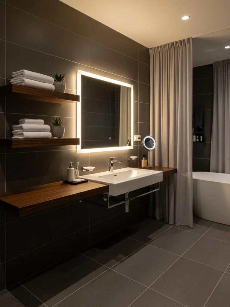 A floating vanity with clean lines and integrated storage enhances both functionality and style. Ambient and accent lighting highlights the textures of the tiles and metallic finishes, creating a warm, inviting atmosphere reminiscent of luxury hotels. Minimal accessories maintain an uncluttered, serene environment.