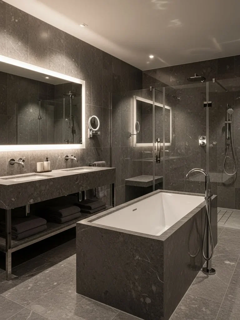 Overall, this bathroom combines style, functionality, and modern luxury. Deep gray stone with chrome accents creates a refined, sophisticated, and serene environment, perfect for homeowners seeking a contemporary and high-end bathroom retreat.