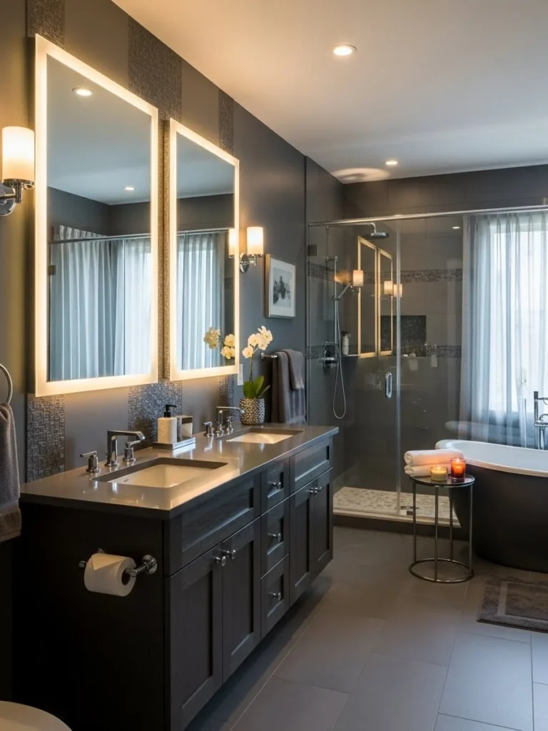 Elegant Deep Gray Bathroom With Chrome Mirror Accents