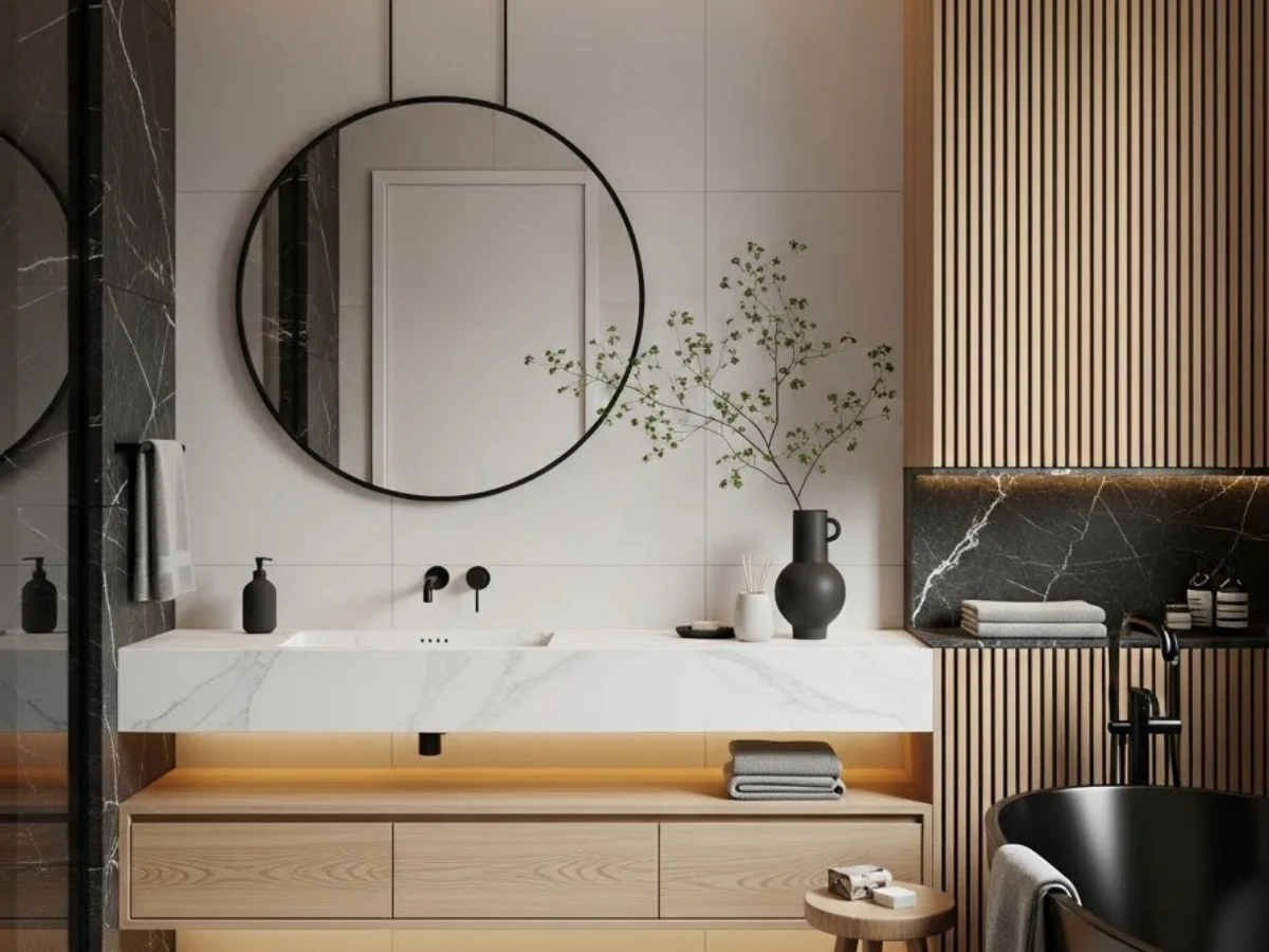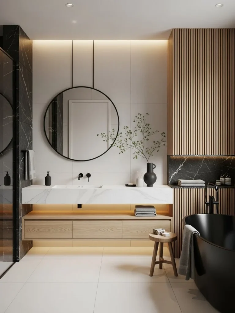 Japandi-Style Bathroom – Black Stone, Marble & Wood