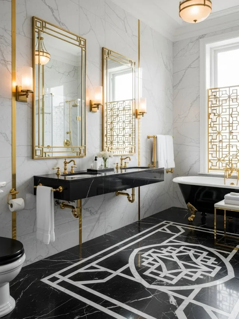 This Art Deco–inspired bathroom blends vintage glamour with modern luxury through bold geometry and rich materials. Black marble floors anchor the space, offering a dramatic base that immediately sets a sophisticated tone. The stone’s natural depth pairs beautifully with crisp white marble accents, creating a timeless monochrome palette.