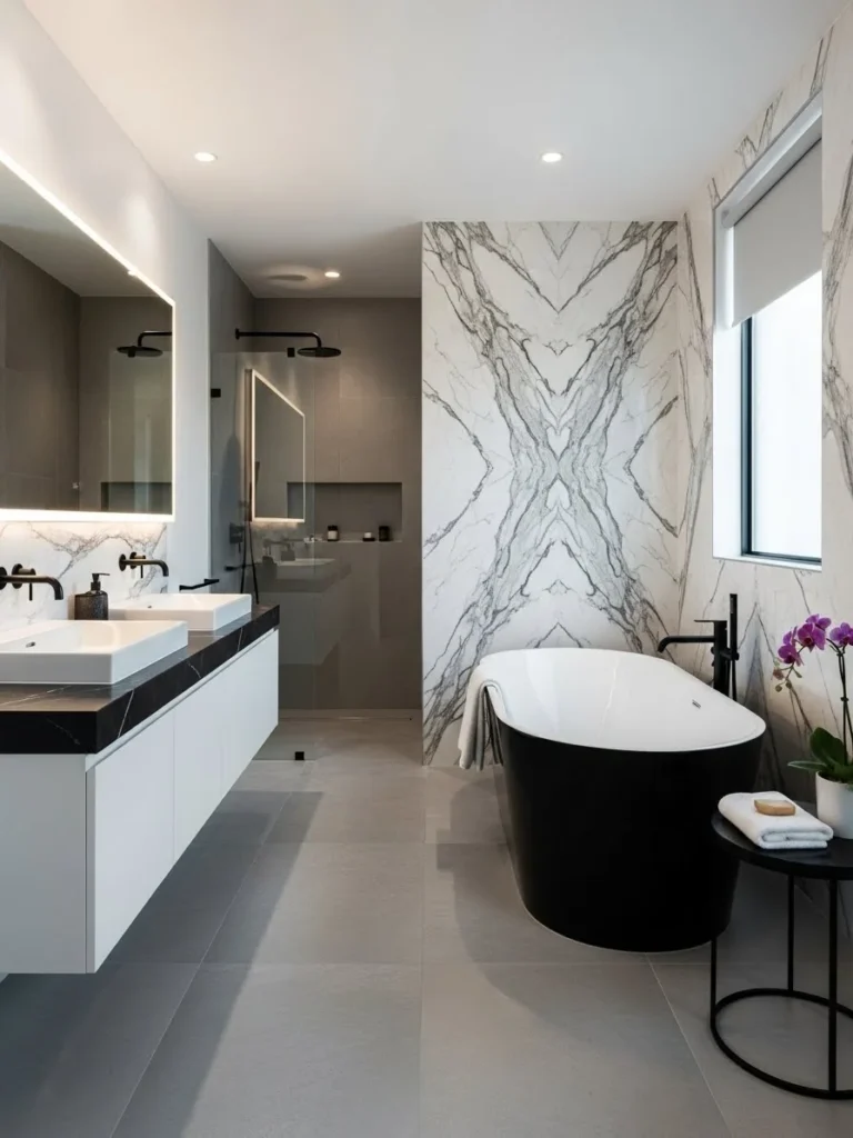 Contemporary Ensuite – Black Tub & Marble Feature Wall