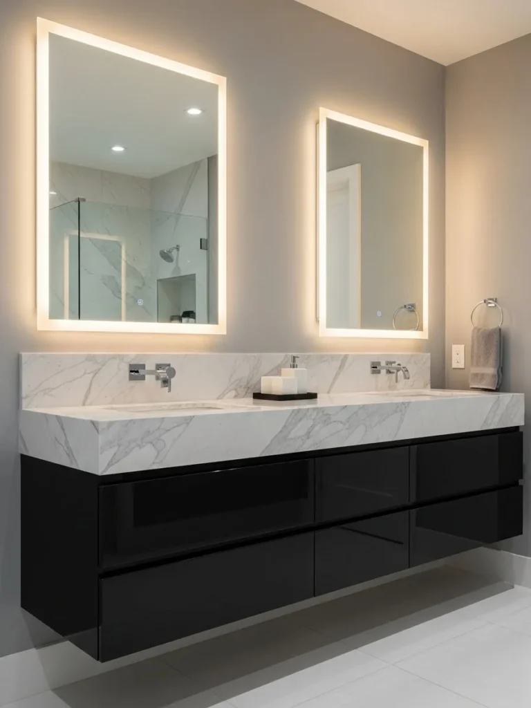 Floating Vanity Bathroom – Black Lacquer & Marble Waterfall Counter