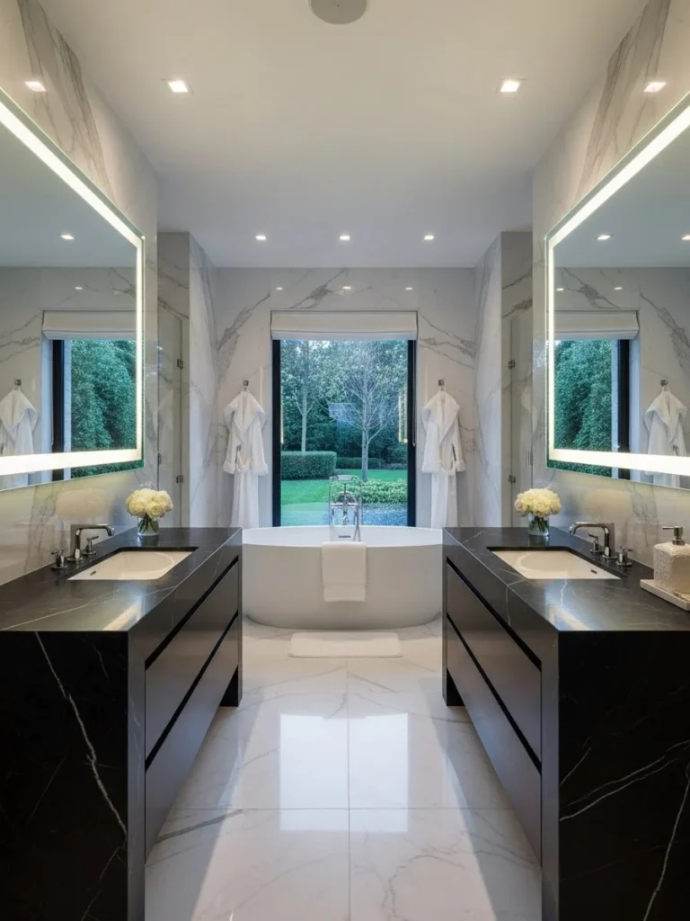 White marble sinks and countertops provide contrast, preventing the darker wall from overpowering the room. Their smooth, lighter surfaces balance the composition while reinforcing a timeless monochrome palette. Clean lines keep the design modern and refined.