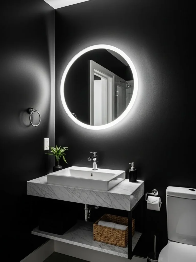 Minimal Powder Bath – Black Walls & Marble Floating Shelf