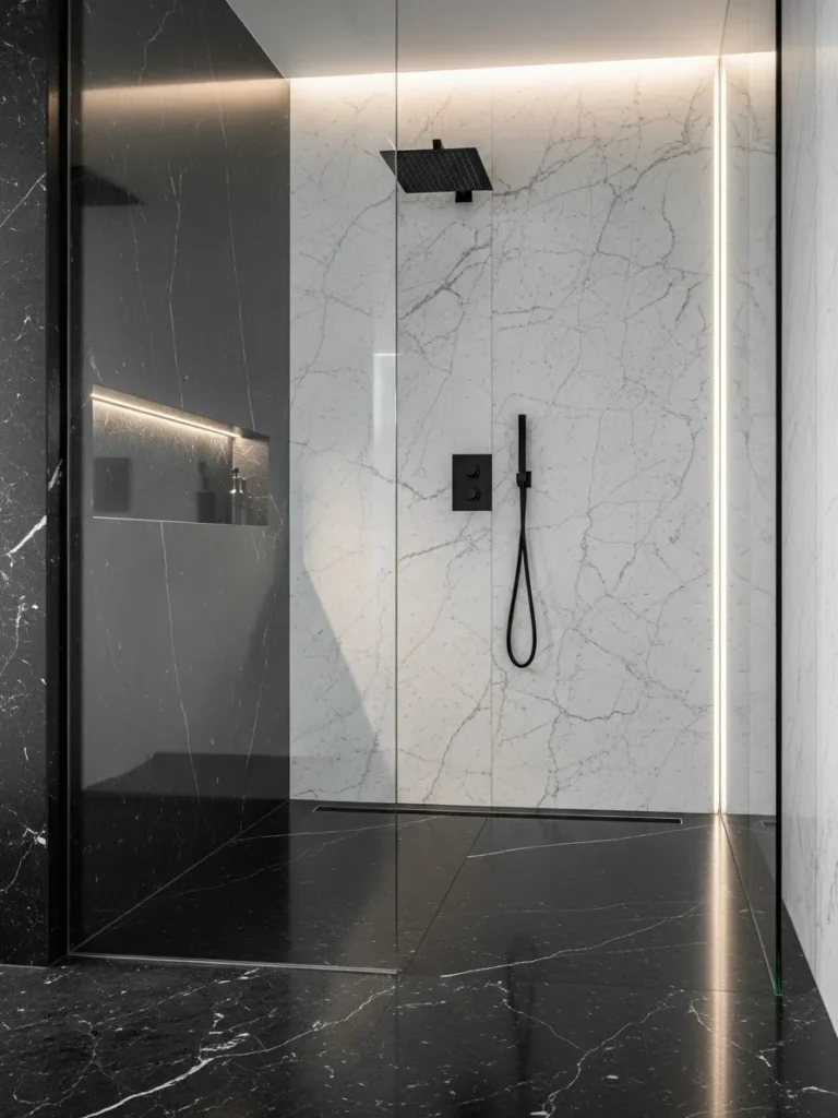 Minimalist Shower Room – Black Marble Floors & Slab Walls