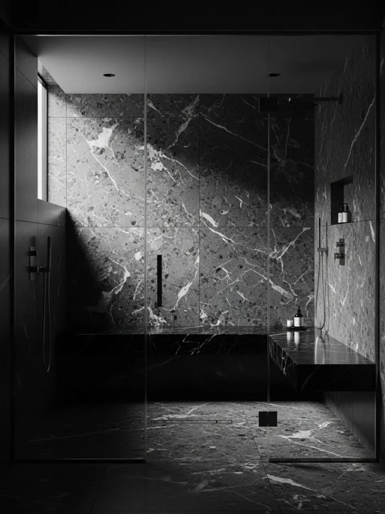 Monochrome Spa Retreat – Marble Steam Shower & Black Stone Bench