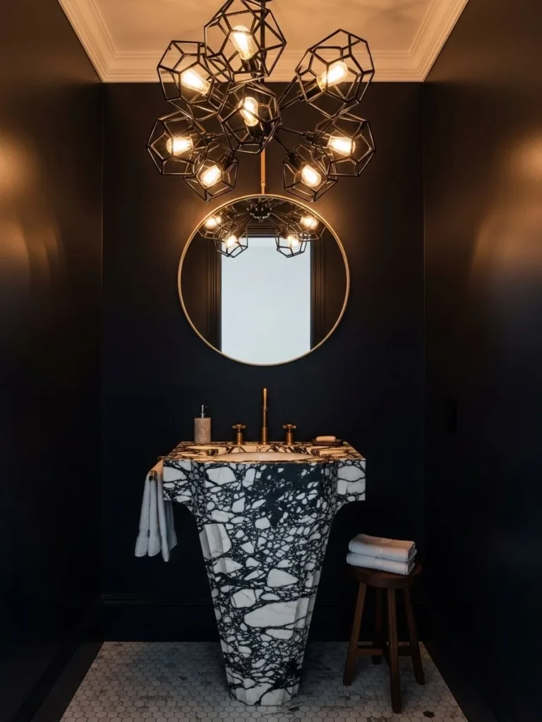 Statement lighting plays a crucial role in elevating the design. A pendant or wall sconce casts warm light, highlighting the marble and adding visual drama. A decorative mirror reflects light, subtly expanding the room.