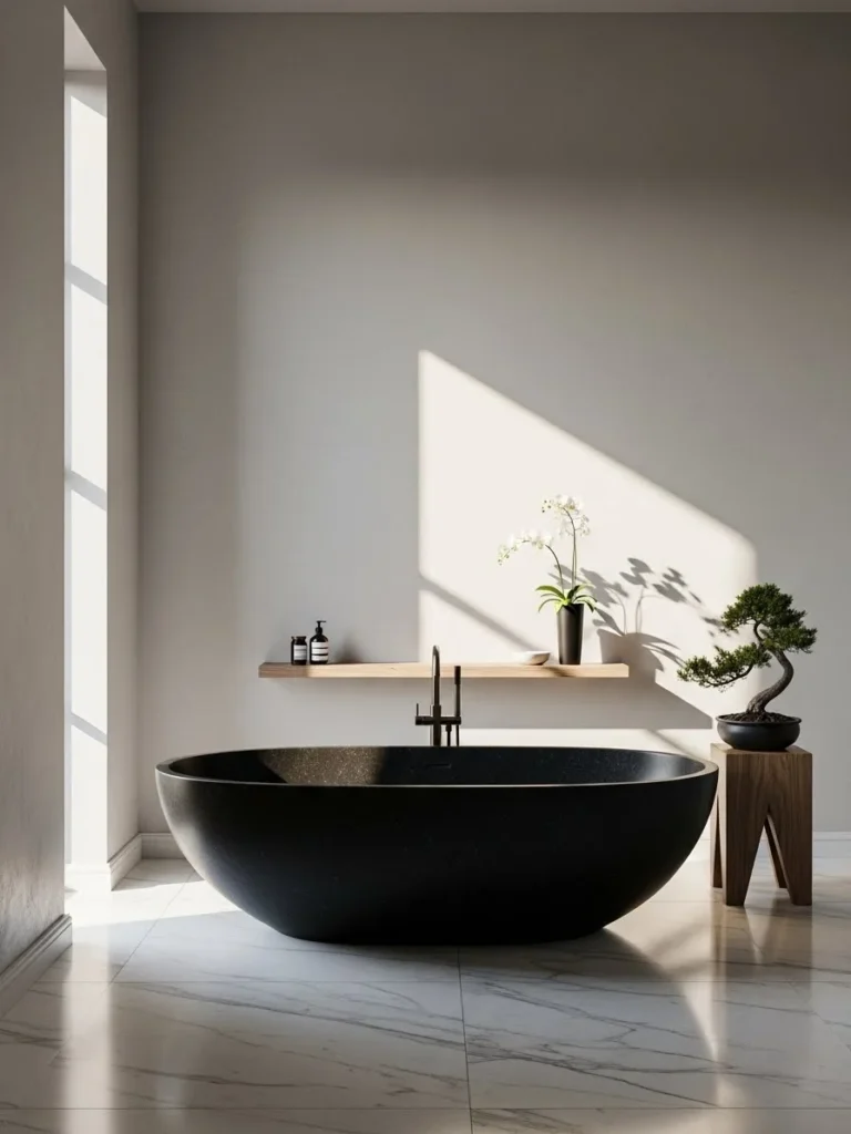This statement bathtub bathroom is centered around bold contrast and sculptural design. A black oval tub becomes the focal point, its smooth form standing out dramatically against lighter surroundings.