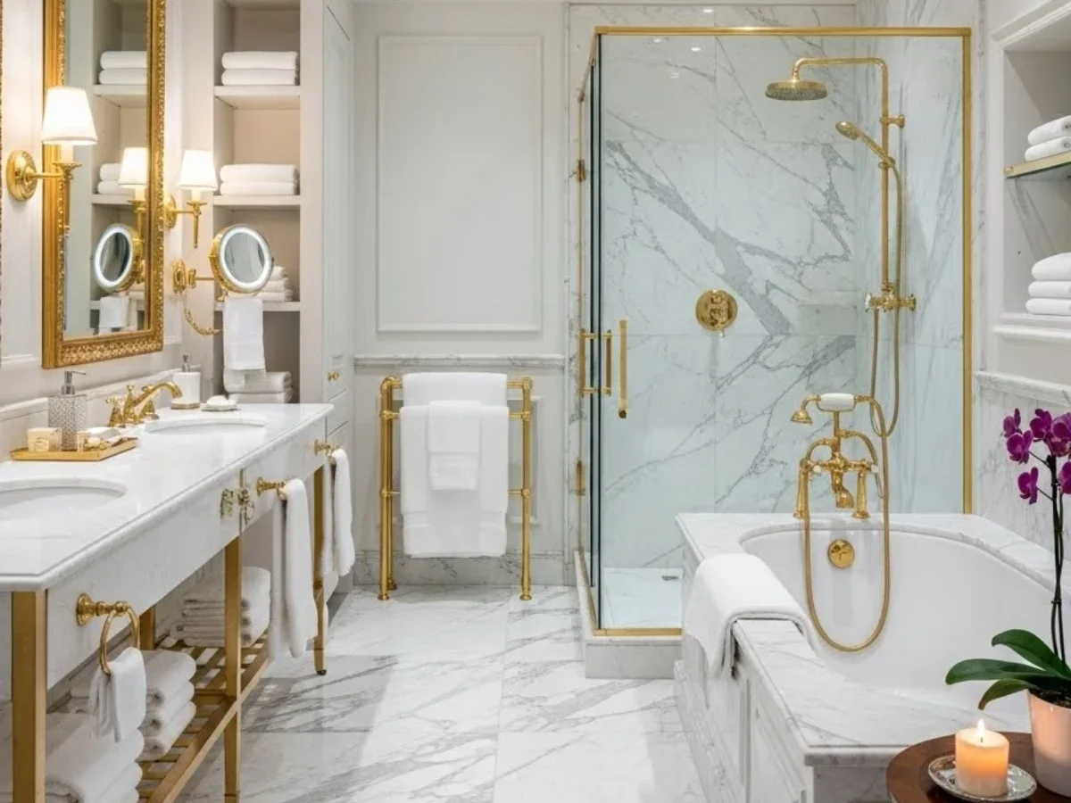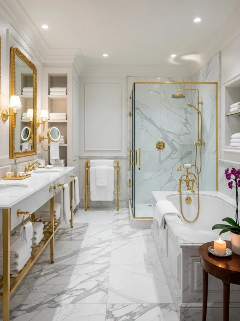 This elegant spa bathroom embodies timeless sophistication, combining marble floors with subtle gold accents for a refined, luxurious look. The polished surfaces reflect soft lighting, enhancing the sense of space and creating a serene atmosphere. Plush white towels and minimal décor complete the spa-inspired aesthetic.