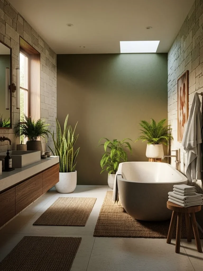 Indoor olive trees or other greenery further reinforce the organic, restorative feel of the space. Smooth, natural surfaces invite tactile engagement, encouraging relaxation and mindful presence. The bathroom feels like a private wellness retreat, removed from daily stress.