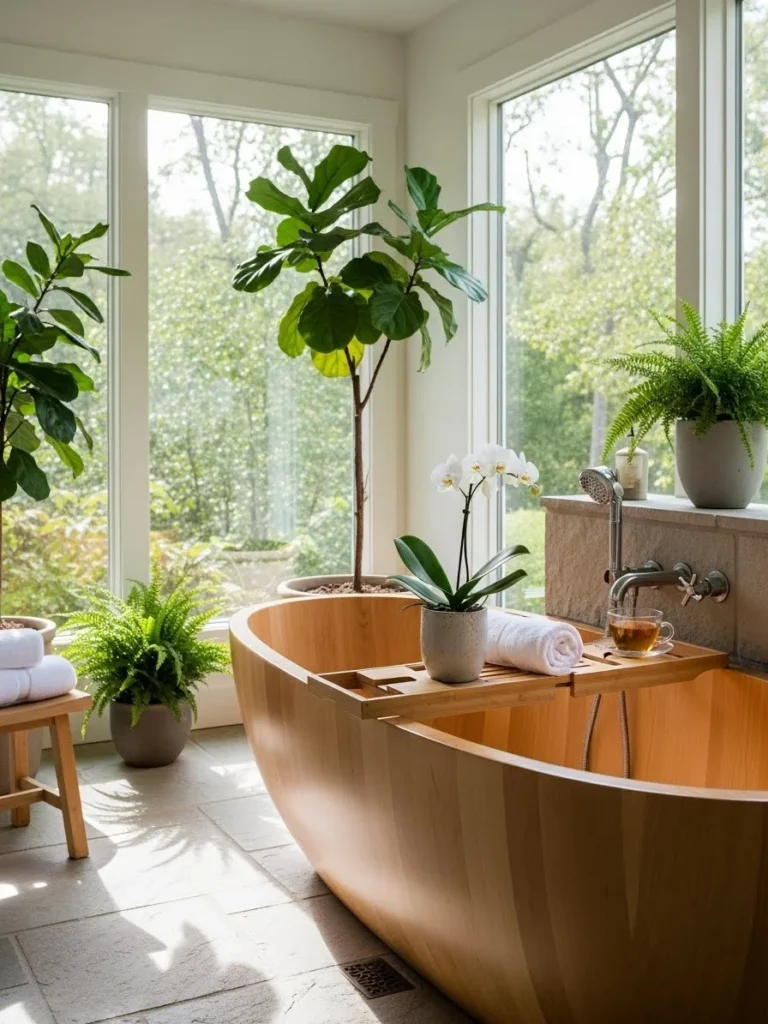 Indoor plants add life and texture, reinforcing the spa-like aesthetic. A natural wood bathtub tray holds candles and bath essentials, blending function with beauty. The combination of greenery, wood, and soft sunlight creates a tranquil sanctuary that feels far removed from daily stress.