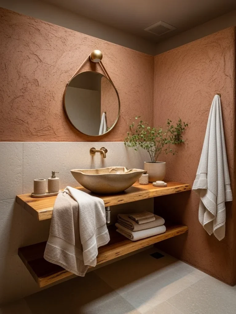 This calm spa bathroom showcases natural clay textures that evoke warmth, earthiness, and a sense of retreat. Smooth clay walls and handcrafted ceramic sinks provide a tactile experience that connects the user to organic materials, fostering mindfulness and tranquility.