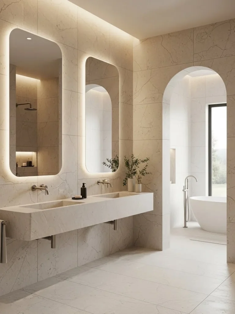 Neutral stone walls and minimalistic furnishings maintain a calming palette, allowing the curved mirrors to act as both functional elements and focal points. The uncluttered environment encourages mindfulness, turning everyday routines into restorative experiences.