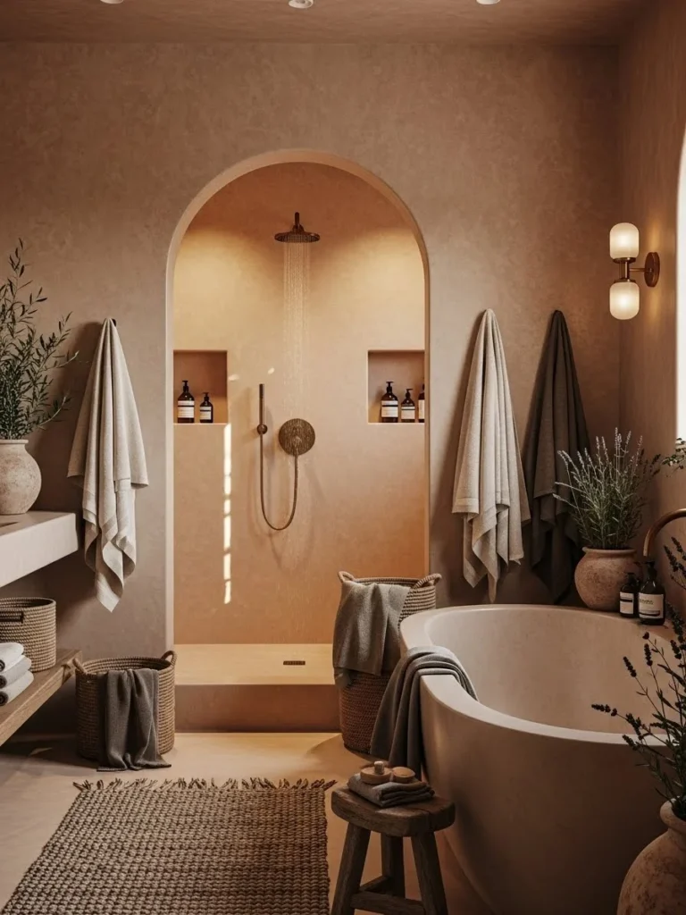This earth-toned bathroom captures the relaxed elegance of a Mediterranean spa retreat. Clay-textured walls and soft arches create a sense of warmth and timeless beauty, while brass fixtures add a subtle glow. The color palette feels grounded and sun-warmed, evoking coastal calm.