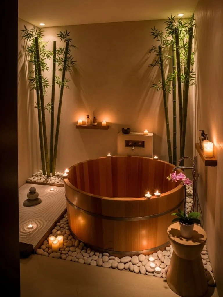 Every detail promotes serenity. The wooden tub becomes a focal point for slow, intentional self-care, turning baths into a ritual rather than a routine. The combination of natural materials, warm lighting, and uncluttered design reinforces calm and harmony.