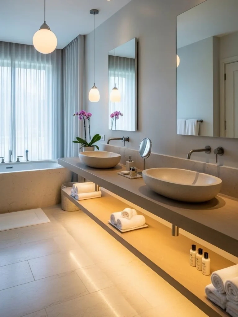 This luxury spa bathroom offers sophistication and serenity in equal measure. A double vanity provides ample space for morning routines, while soft under-cabinet lighting casts a gentle glow that transforms the room into a private retreat. Stone sinks add tactile elegance and elevate the spa-like atmosphere.