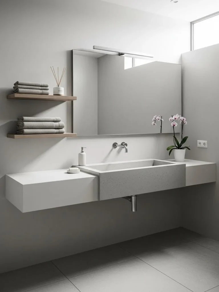 This minimal spa bathroom embraces understated elegance and simplicity. A sleek concrete sink serves as the focal point, its smooth, tactile surface paired with floating shelves that hold neatly folded linens and essential accessories. The space is uncluttered, emphasizing clarity, balance, and calm.