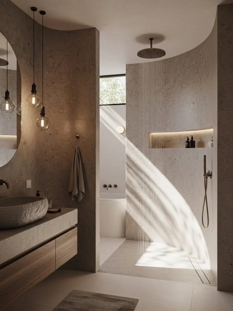 The design emphasizes mindfulness. By reducing visual distractions and embracing natural shapes, this bathroom transforms everyday routines into restorative rituals. It invites slow, deliberate movement, encouraging moments of quiet reflection before the day begins.