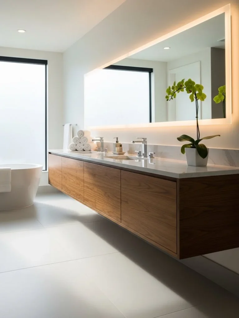This modern spa bathroom blends clean lines with warm details to create a space that feels both refined and calming. A floating vanity gives the room an open, airy quality, while a backlit mirror casts a soft, flattering glow. Marble countertops add a touch of quiet luxury without overwhelming the design.