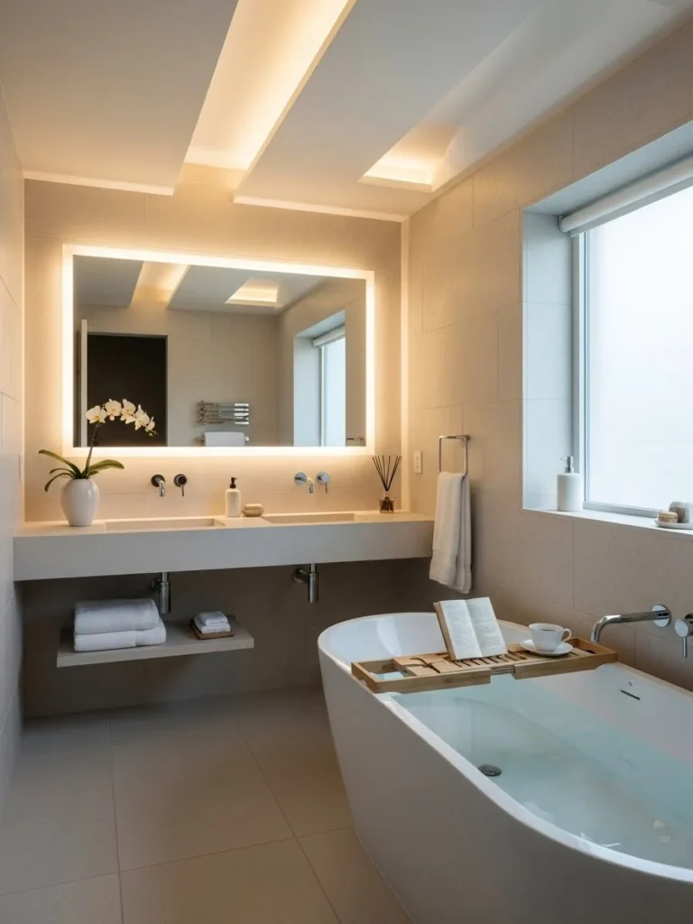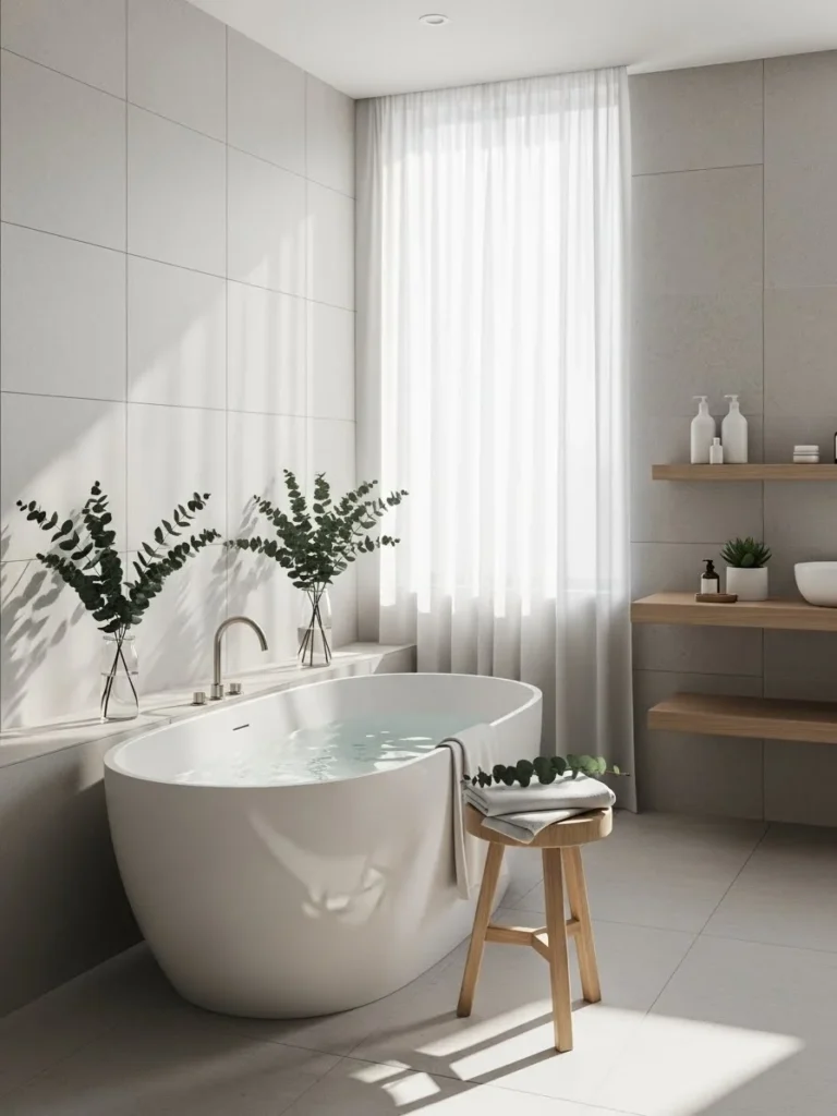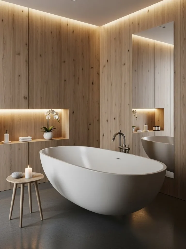 Indirect lighting highlights textures and contours, creating a soft, serene ambiance that complements the bathtub’s sculptural form. Soft linens and carefully chosen accessories enhance comfort without overcrowding the minimalist aesthetic.