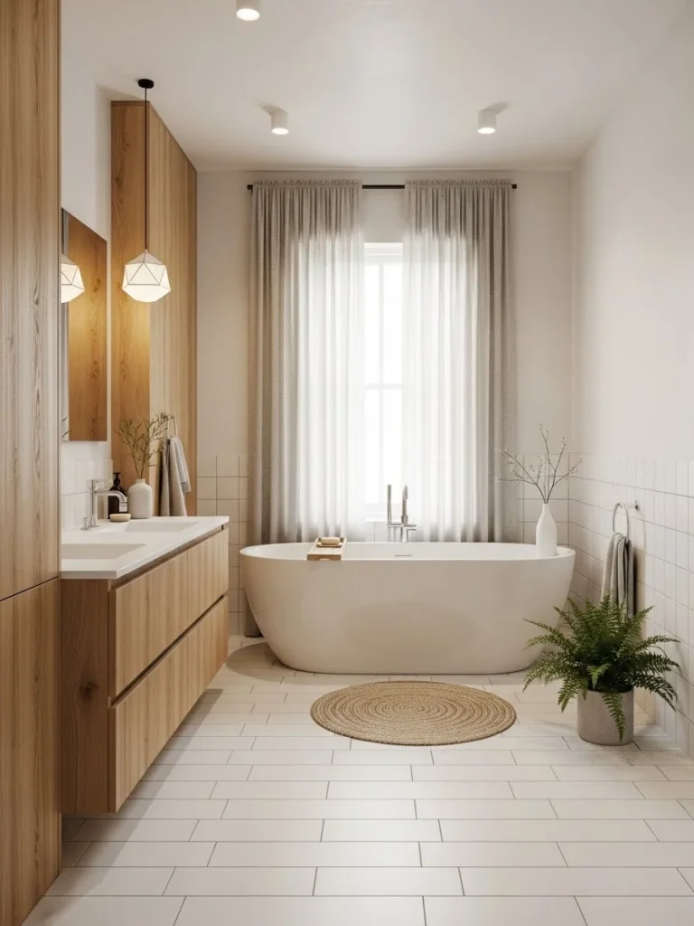 This Scandinavian-inspired bathroom emphasizes simplicity, warmth, and functionality. Light oak wood paired with crisp white tiles creates a harmonious, clean aesthetic. Linen curtains filter soft daylight, enhancing the serene and understated vibe that defines Scandinavian spa design.