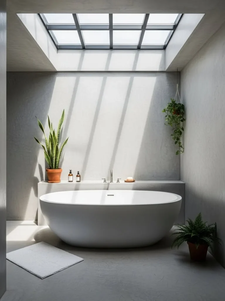This spa bathroom features a freestanding tub positioned beneath a skylight, inviting soft natural light to fill the space. Morning sun gently illuminates the room, creating a serene, uplifting ambiance that enhances a sense of well-being. Smooth concrete walls and understated décor keep the environment clean, minimal, and calming.