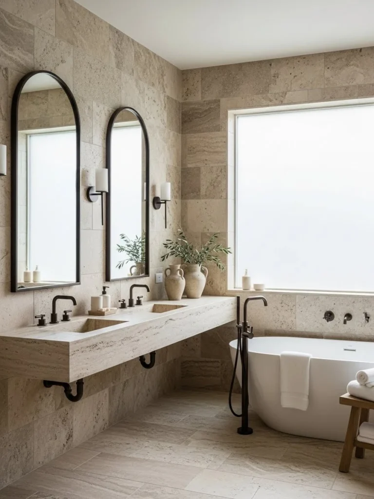 This spa-inspired bathroom features travertine stone walls that exude warmth and timeless elegance. The natural stone adds texture and depth, creating a tactile, visually calming environment reminiscent of high-end Mediterranean spas. The subtle variations in color bring an organic, grounded feel to the space.