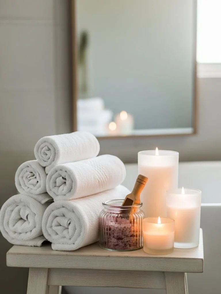 This spa-like bathroom corner exudes calm and order, featuring neatly folded towels, bath salts, and softly glowing candles. Every item is carefully arranged to enhance a sense of tranquility, creating a visual and sensory oasis that feels intentionally curated for relaxation.