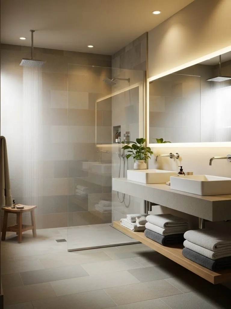 Natural materials and minimalist design reinforce serenity. Smooth stone surfaces, plush towels, and subtle wooden accents create tactile comfort, while the muted color palette keeps visual distractions minimal, supporting calm and focus.
