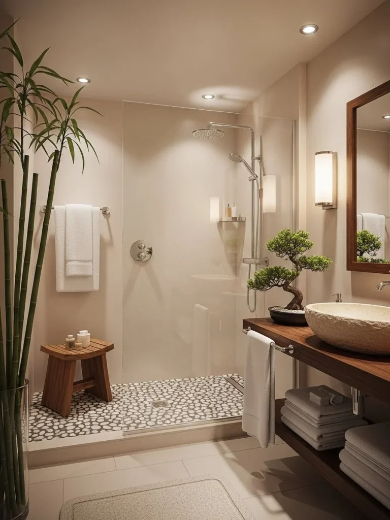 Zen-Inspired Bathroom with Pebble Shower Floor
