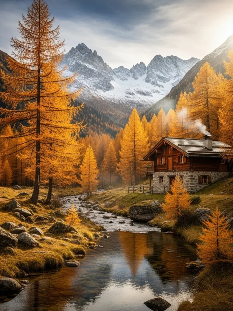 Autumn Transition Chalet Surrounded By Golden Larch Trees