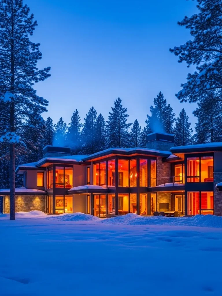The architectural photography of this moment emphasizes the transparency of the building. Through the glass, one can see the life of the home: a table being set for dinner, the flicker of a movie in the loft, and the steam rising from a bathroom window. The home doesn’t just sit in the blue landscape; it glows within it like a hearth fire. The snow on the roof takes on a violet tint, and the ice hanging from the eaves sparkles like diamonds against the dark sky.