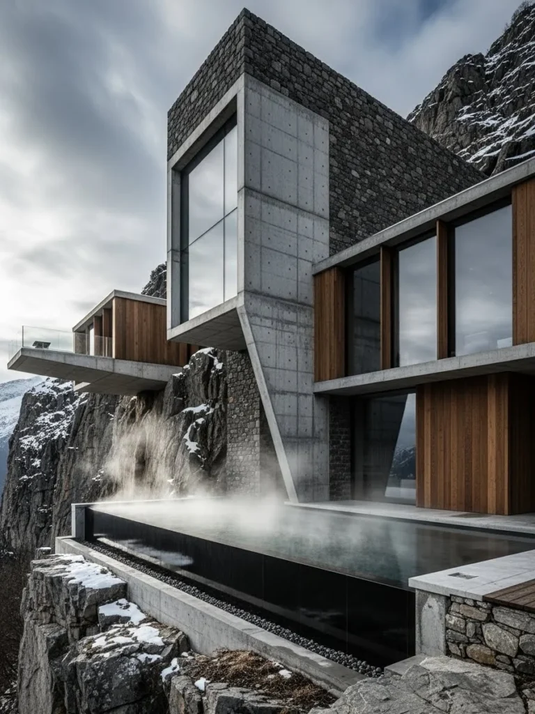 Carved directly into the granite face of the mountain, this chalet is a masterclass in the beauty of raw, organic materials. The architecture utilizes heavy concrete and local stone to mimic the textures of the cliff, making the home feel like a permanent extension of the earth. Massive vertical slits in the stone serve as windows, casting dramatic shafts of light across the interior hallways. It is a fortress of luxury, designed to withstand the harshest elements while providing total serenity.