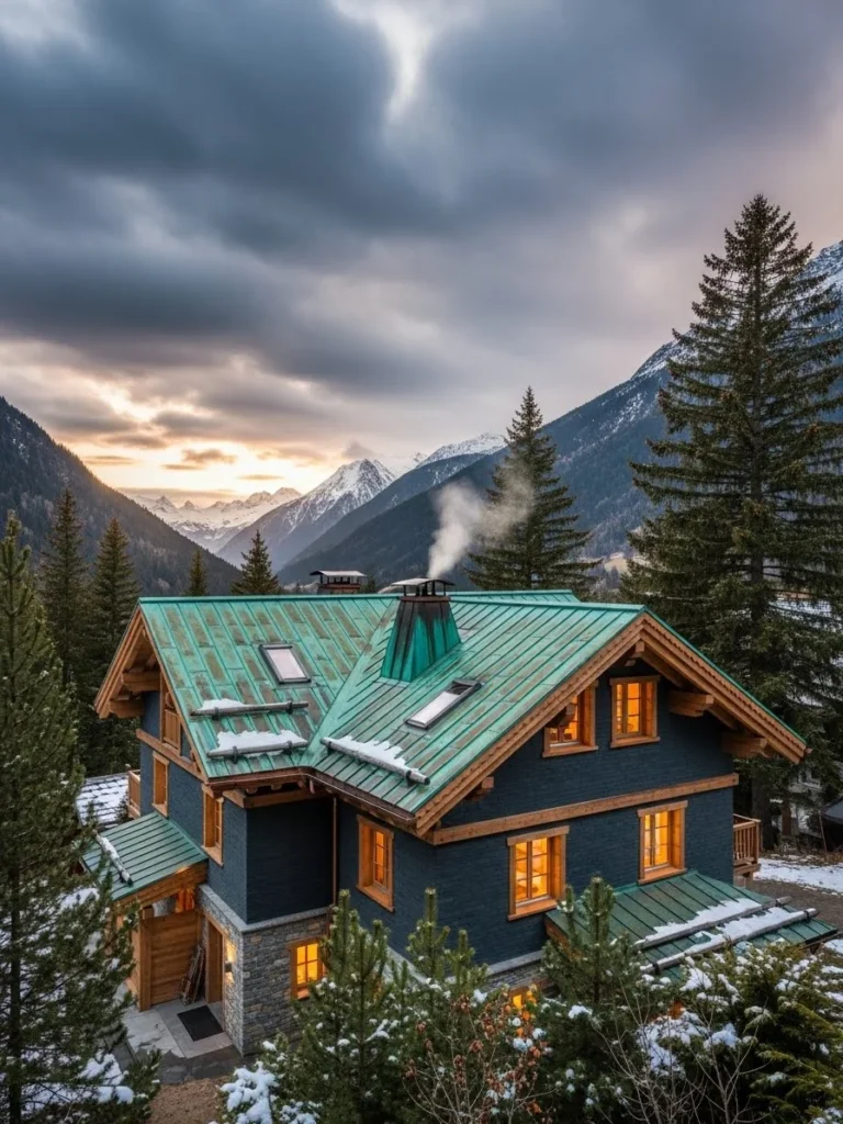 Lighting is used to highlight the metallic sheen of the copper, with recessed spotlights casting warm glares across the textured surfaces. The overall atmosphere is one of rugged elegance, suitable for someone who appreciates the raw power of the earth. The “Copper and Slate” chalet stands as a bridge between the geology of the mountain and the refined world of human habitation, offering a sensory experience that is both primitive and incredibly sophisticated.
