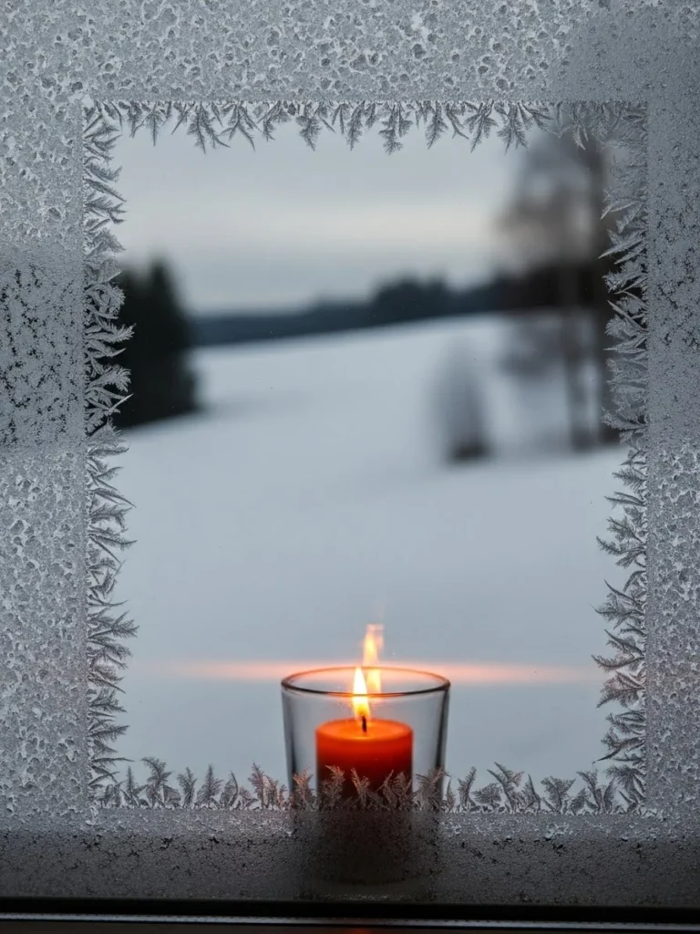 This prompt shifts the focus from grand scale to the intimate, sensory details of alpine life. The “camera” is positioned just outside a thick, triple-paned window that has been naturally framed by intricate, crystalline frost patterns. Through the clear center of the glass, we see a blurry but inviting interior: a single flickering candle on a wooden table, a half-full glass of red wine, and the soft glow of a fireplace in the background. It is an image that perfectly captures the feeling of “hygge.”