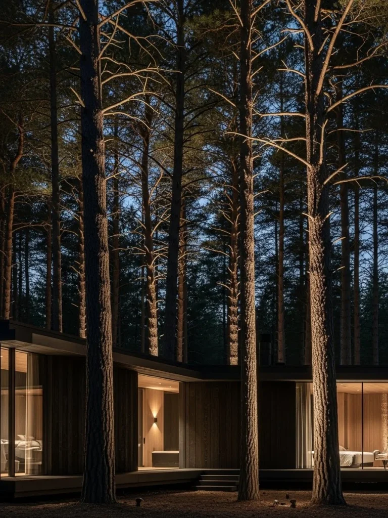 As the path nears the house, the lighting becomes warmer and more concentrated, eventually leading to a massive glass pivot door that serves as the final destination. The transition from the dark, cool forest to the brilliantly lit interior is a carefully choreographed moment of “compressed and released” space. The use of recessed lighting ensures that there is no “light pollution,” preserving the darkness of the mountain sky so that the stars remain visible even as you walk.
