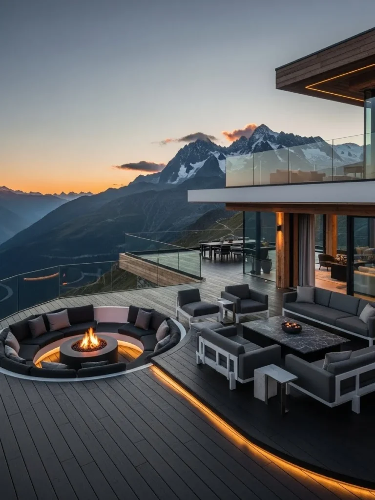 The outdoor spaces are designed for sunset rituals, featuring a heated infinity-edge spa that looks as though it is spilling directly into the glowing clouds. A built-in stone fire pit provides a place to gather after dark, with fur-lined chairs and a telescope for stargazing. This chalet is for the dreamer and the romantic, someone who understands that the most valuable luxury in the mountains is the time spent watching the world change colors from the height of a private peak.