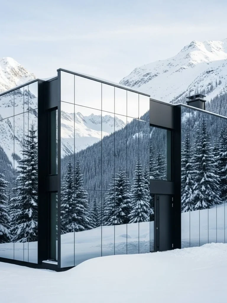 This extraordinary dwelling utilizes high-tech mirrored glass to achieve a state of near-total invisibility. By reflecting the surrounding pine forest and the vast, open sky, the facade shifts its appearance with every passing cloud and change in light. In the height of winter, the structure becomes a ghost in the landscape, its sharp corners only betrayed by the thin, matte black frames that define the edges of the panels. It is a radical approach to alpine luxury that prioritizes the environment over the architecture.