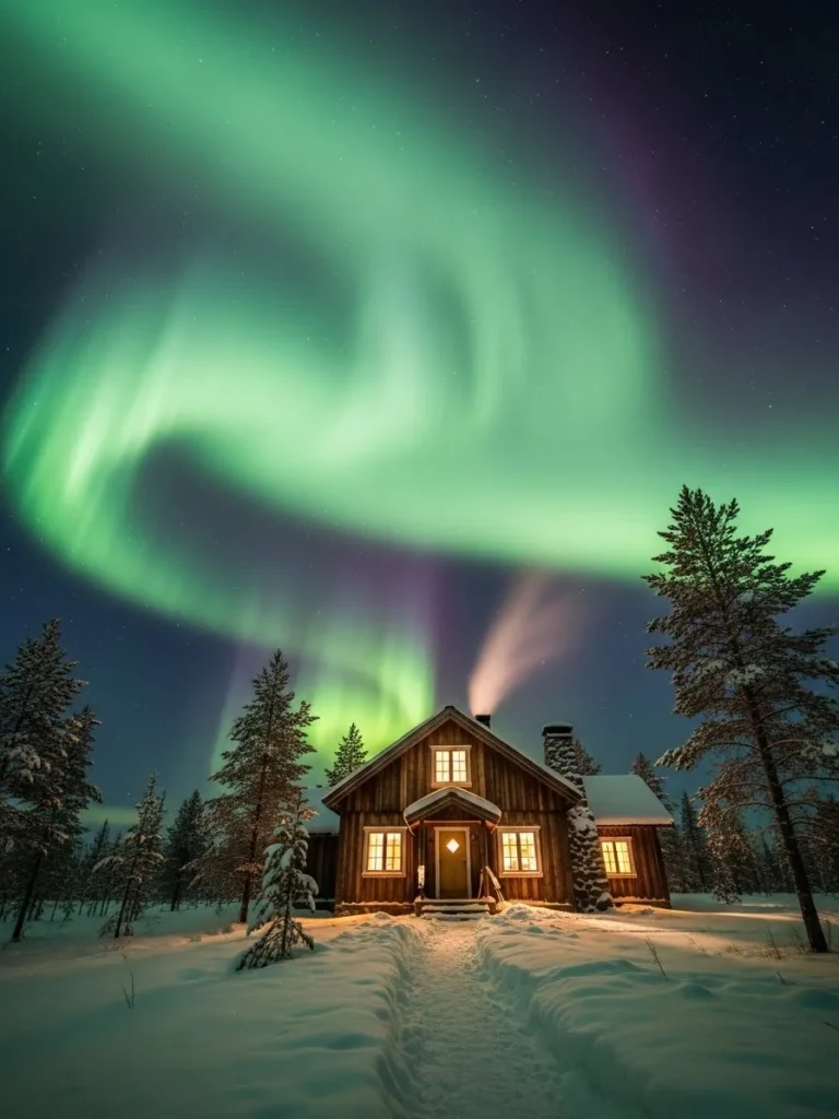 This residence is a masterpiece of nocturnal architecture, designed specifically to capitalize on its location beneath the world’s most active geomagnetic corridors. The structure is a dark silhouette against the vibrant celestial display, featuring a roofline that mimics the jagged peaks of the horizon. As the Northern Lights dance in ribbons of emerald, violet, and crimson across the sky, the chalet acts as a silent observer, its presence felt more through its glowing windows than its physical form.