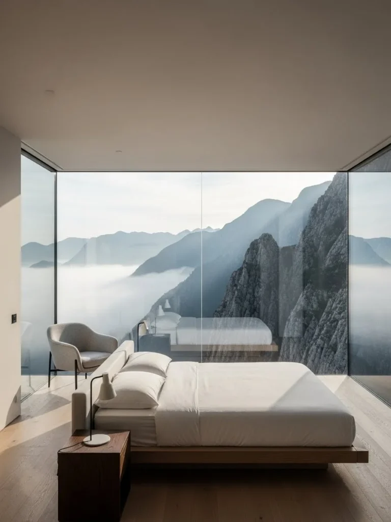 The interior of the suite is kept intentionally sparse to emphasize the gravity-defying view. A low-profile platform bed sits in the center of the room, draped in layers of fine white linen and charcoal cashmere. The walls are paneled in soft, light-colored felt, which provides excellent acoustic insulation against the whistling mountain winds. In the morning, the rising sun hits the windows first, bathing the room in a soft, pinkish hue that signals the start of another day above the clouds.