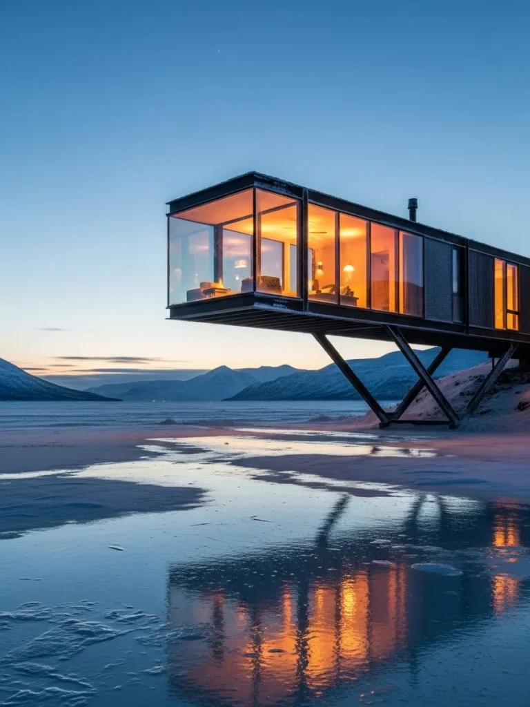 This architectural masterpiece redefines mountain living through a bold use of industrial materials and daring structural engineering. Suspended precariously over the glassy surface of a high-altitude lake, the home features a dramatic black steel frame that contrasts sharply with the pristine white snow. Large-format glass panels replace traditional walls, offering an unobstructed view of the ice below and the jagged peaks beyond, making the structure feel like a dark jewel set in a frozen crown.