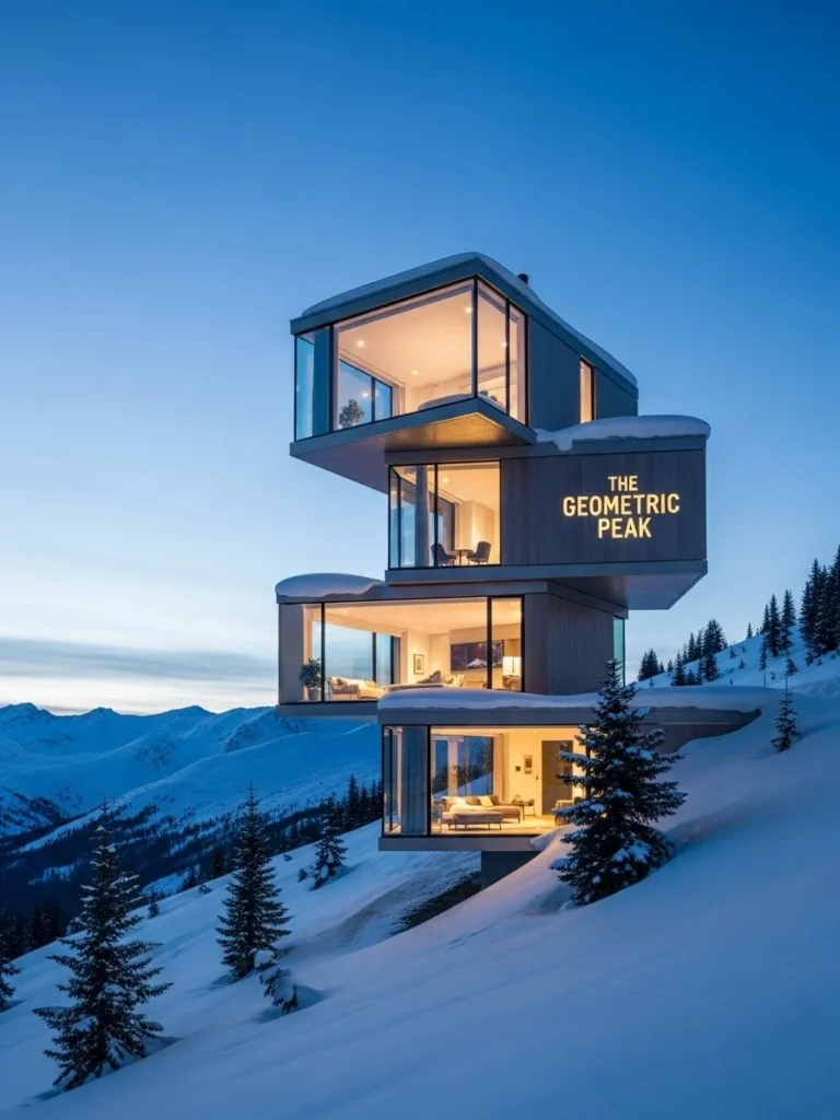 This architectural marvel stands as a testament to fragmented beauty, featuring a series of offset, stacked glass volumes that seem to defy gravity. By shifting the orientation of each floor, the design creates a series of private cantilevered balconies and sheltered nooks that offer varied perspectives of the surrounding mountain range. The sharp, clean edges of the glass and steel frames provide a striking contrast to the soft, rounded snowdrifts that pile up against the foundation of the lower levels.