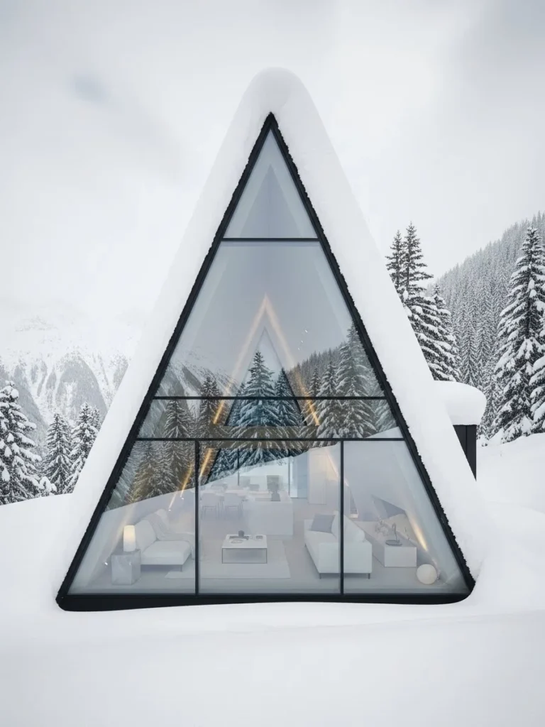 Rising from the snow like a crystalline formation, this triangular glass chalet is a triumph of geometric design. The steep pitch of the roof is not just an aesthetic choice; it allows the heavy alpine snowfall to slide off gracefully, creating natural white curtains on either side of the transparent structure. The sharp angles of the glass reflect the surrounding pine trees, making the house appear to change its color and texture depending on the movement of the clouds above.