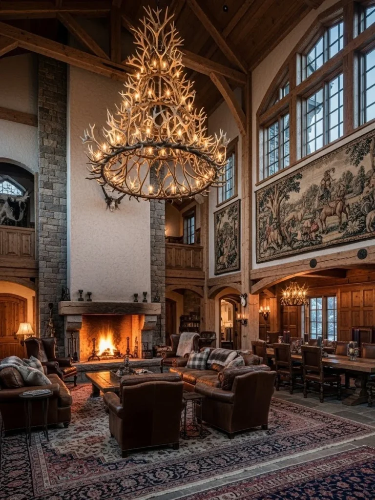 Natural light floods the Great Hall through a series of arched windows that reach nearly to the ceiling. These windows are fitted with custom-made iron lattices that create beautiful, intricate shadows on the hardwood floors throughout the day. At night, a massive antler chandelier—crafted from naturally shed elk horns—descends from the center of the room, providing a warm, rustic glow that illuminates the rich textures of the stone and timber.